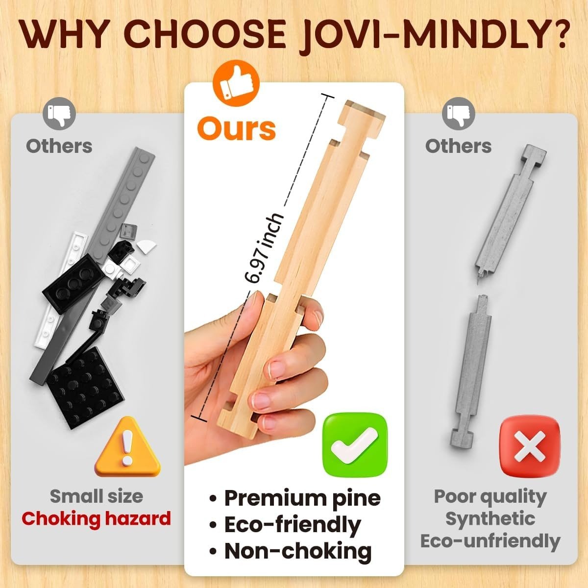 Crafted from non-toxic, eco-friendly wood, our blocks ensure a safe play environment for children. They’re free from harmful chemicals and glue, so parents can feel confident while their kids enjoy hours of creative fun. The smooth, polished surfaces and rounded edges make them safe for small hands to grip and build with.