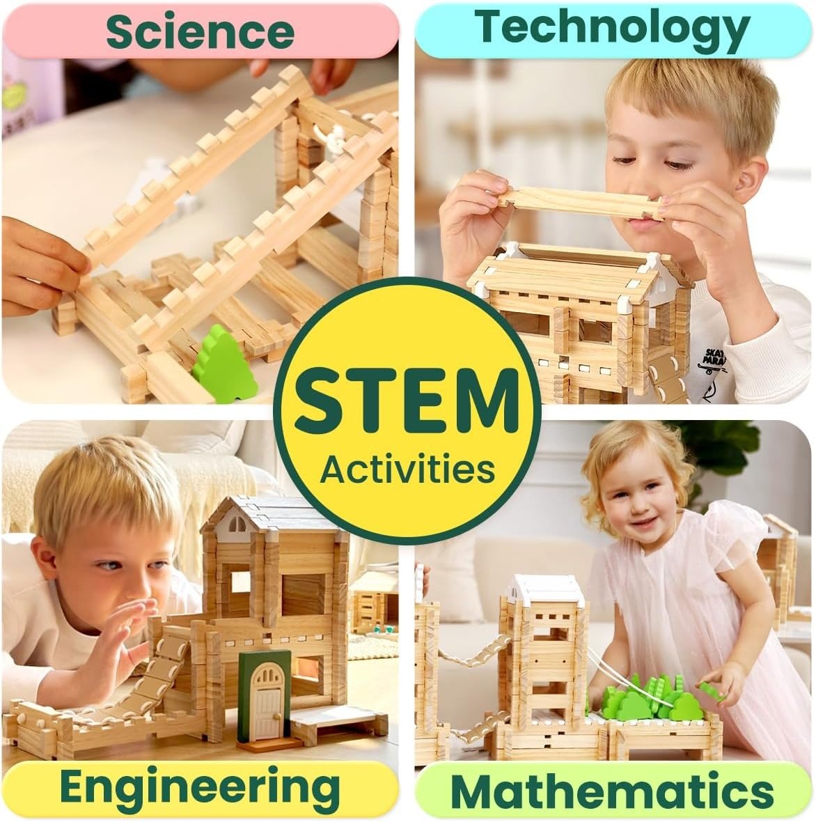 "These wooden blocks are great for encouraging my kids’ creativity. They love making different structures, and it's a great way to get them to focus and work together!"